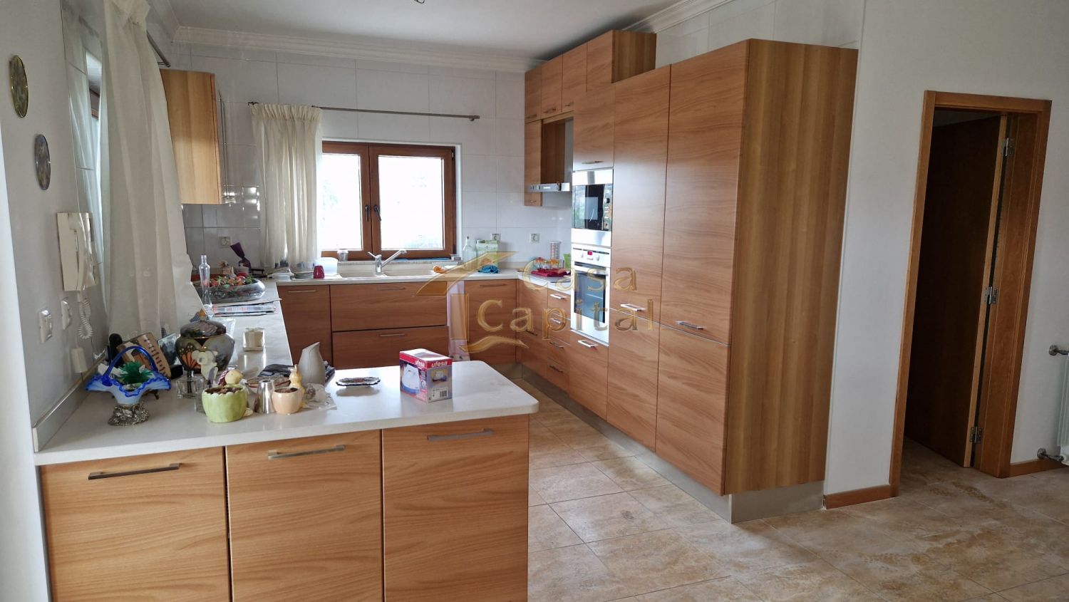 No 1º andar tem uma outra cozinha, salão com recuperador a lenha, despensa, quarto com suíte, escritório, c. banho completa e grande varanda.